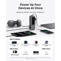 - Punite 4 uređaja istovremeno: Nikada vam neće ponestati energije – punite pametne telefone, tablete ili druge USB uređaje. Povežite do četiri uređaja istovremeno pomoću dva USB-C kabla, USB-A priključka i dodatnog USB-C priključka.